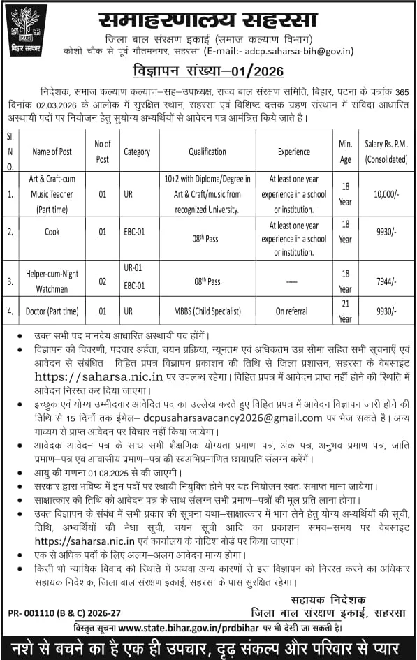 Bihar Jila Baal Sanrakshan Bharti 2026 के तहत जारी यह भर्ती Saharsa district से संबंधित है, जो राज्य का एक महत्वपूर्ण प्रशासनिक क्षेत्र है। Here we will notify you about Teacher, Cook, Helper, Watchman, Doctor Bharti 2026 in Bihar Notification, Last Date to Apply, Apply Online, Official Website, PDF, Important Dates & More. इस जिले का प्रशासनिक और सामाजिक ढांचा मजबूत है, जिससे यहां सरकारी योजनाओं और सेवाओं का प्रभावी संचालन किया जाता है।